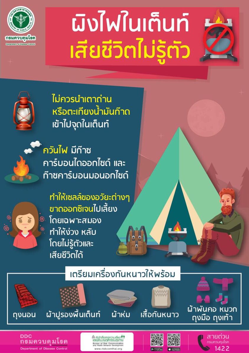 กางเต็นท์แคมป์ปิ้งนอนช่วงท่องเที่ยวหน้าหนาว ไม่ควรนำเตาถ่านหรือตะเกียงน้ำมันก๊าดเข้าไปจุดในเต็นท์ เพราะในควันไฟมีก๊าซคาร์บอนไดออกไซด์ และก๊าซคาร์บอนมอนอกไซด์ จะทำให้เซลล์ของอวัยวะต่างๆ ขาดออกซิเจนไปเลี้ยงโดยเฉพาะสมอง อาจทำให้เสียชีวิตได้