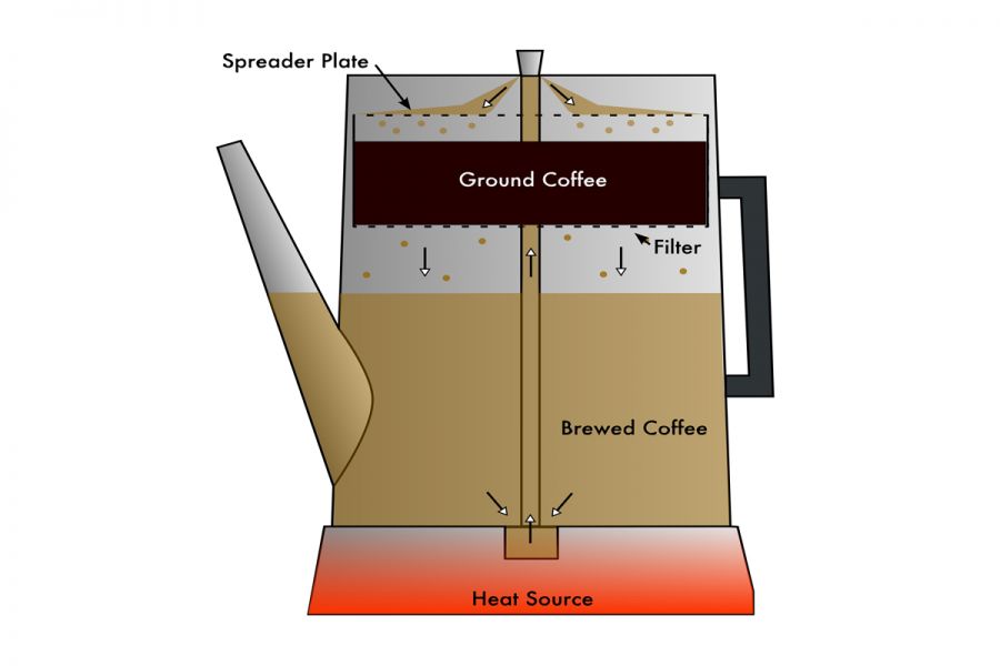 Percolator” เป็นหมอต้มที่ใช้หลักการสกัดกาแฟแบบแรงดันไอน้ำ เมื่อต้มน้ำในหม้อจนเดือด น้ำร้อนจะดันสูงขึ้นแล้วไหลไปตามท่อแกนกลางขึ้นสู่ด้านบนที่เป็นตะแกรงกรองหรือฟิลเตอร์ข้างในบรรจุกาแฟคั่วบด เมื่อน้ำร้อนพุ่งผ่านผงกาแฟในฟิลเตอร์แล้วจะตกผ่านฟิลเตอร์ลงสู่หม้อด้านล่างอีกครั้ง หมุนวนเวียนอย่างนี้จนกว่าจะยกหม้อต้มลงจากเตาไฟ ใช้เวลาและความร้อนเป็นตัวควบคุมความ “เข้มข้น” ดังนั้น กาแฟจะ “เข้มมาก” หรือ “เข้มน้อย” ก็อยู่ที่รอบของน้ำกาแฟที่หมุนเวียนนี่แหละ