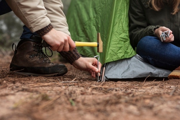 - ตรวจสอบให้แน่ใจว่าสมอบกปักแน่นแล้ว โดยดึงเชือกเต็นท์ให้ตึง