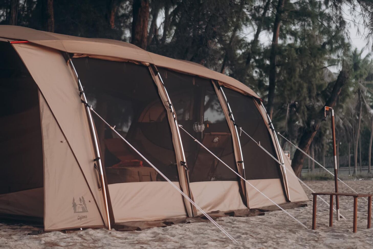 อุปกรณ์พื้นฐานที่สุดไม่ว่าจะไปแคมป์ปิ้งที่ไหน สำหรับเต็นท์ที่เตรียมไปกางริมชายหาดควรเลือกที่มีความแข็งแรงโดยเฉพาะโครงสร้าง เพราะการกางเต็นท์ริมชายหาด ต้องเจอกับลมที่แรง และพื้นที่เป็นทราย หากไม่แข็งแรงมั่นคงมากพออาจจะทำให้ปลิวหรือเสียหายได้ง่ายๆ
