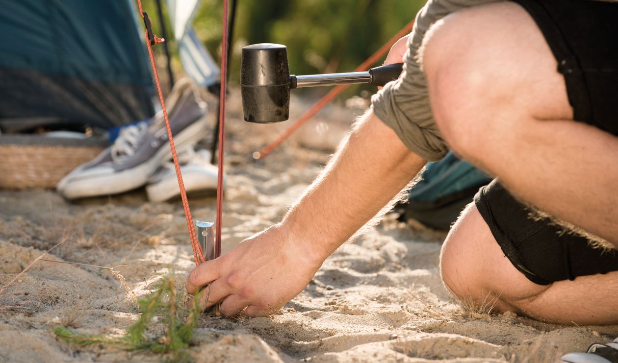 สมอบกที่ใช้ยึดเต็นท์ควรจะเป็นแบบที่ใช้กับพื้นทรายโดยเฉพาะเพื่อให้มีการยึดเกาะที่แน่น ทำให้หมดห่วงเรื่องลมที่แรงจนหอบเอาเตนท์ปลิวลงทะเล