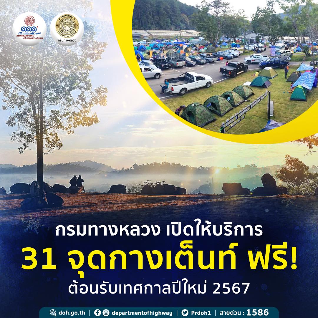 เพจกรมทางหลวงได้โพสต์ผ่านเพจเฟซบุ๊ก กรมทางหลวง ว่าเปิดให้บริการ 31 จุดกางเต็นท์ฟรี ตัอนรับเทศกาลปีใหม่ 2567 โดยโพสต์ว่า