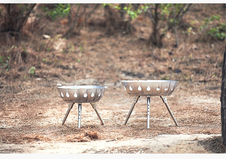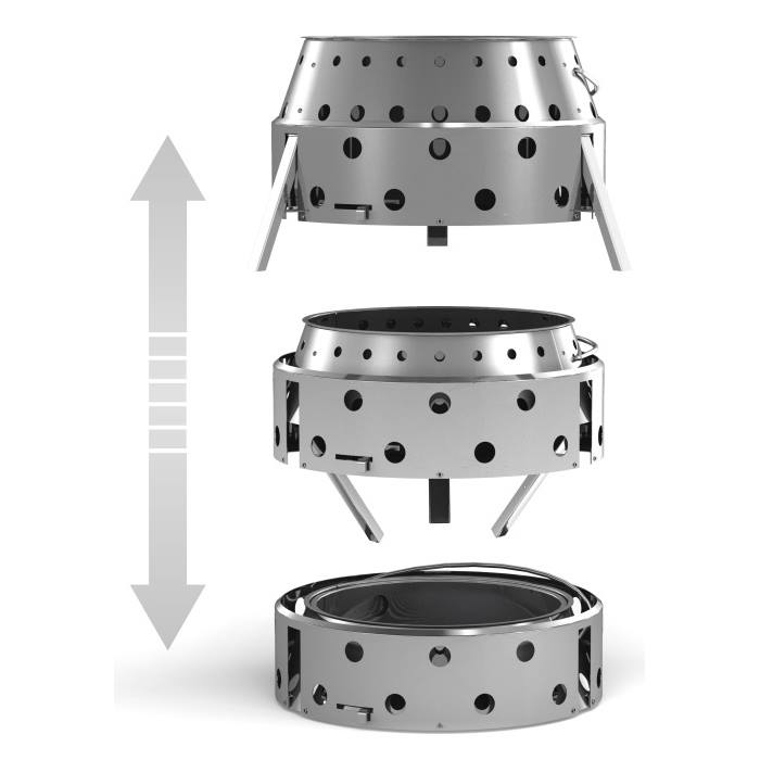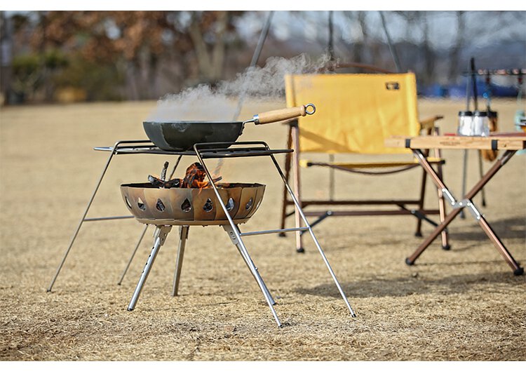 เตาฟืนจาก minimal works แบรนด์อุปกรณ์แคมป์ปิ้งจากเกาหลี เป็นเตาอั้งโล่แบบพับได้ พกพาสะดวก และใช้งานง่าย ได้แนวคิดมาจากการออกแบบหม้อนึ่งสำหรับทำอาหาร ขาตั้งสามารถปรับความสูงได้ มี2ขนาด M-L ตัวเตามีช่องระบายอากาศด้านใต้และด้านข้าง ช่วยให้เกิดการไหลเวียนอากาศที่ดี วัสดุเตาทำจากสแตนเลส แข็งแรง ทนทาน ไม่เป็นสนิม