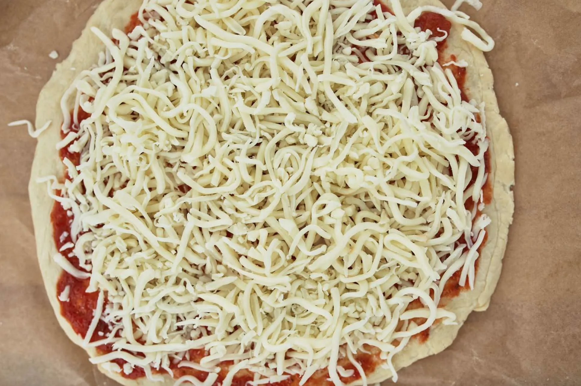 จากนั้นให้ราดซอสพิซซ่าให้ทั่วแผ่นแป้ง และตามด้วยท็อปปิ้งต่างๆ ที่ได้เตรียมไว้ ปิดท้ายด้วยมอสซาเรลล่าชีส