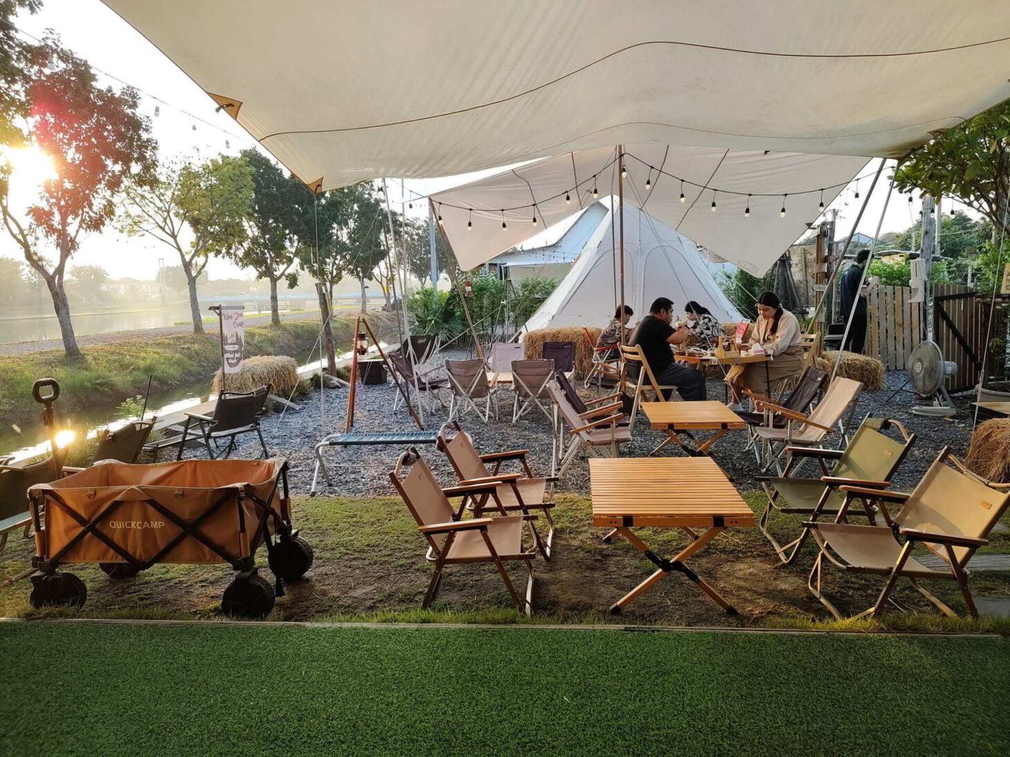 ร้านตกแต่งด้วยอุปกรณ์แคมป์ปิ้งแน่ๆ ทั้งเต้นท์ ทาร์ป โต๊ะ เก้าอี้ ตะเกียงโคมไฟ ที่จัดตกแต่งได้อยากลงตัว ให้ฟีลเหมือนเราได้ออกไปกางเต็นท์ตั้งแคมป์เลย รอบๆ ร้านมีพื้นที่สีเขียวค่อนข้างเยอะ บรรยากาศริมน้ำ(คลองประปา) บอกเลยว่าเป็นอีกหนึ่งร้านที่น่ามานั่งชิล ลองแวะไปได้บรรยากาศดีอยู่นะครับ