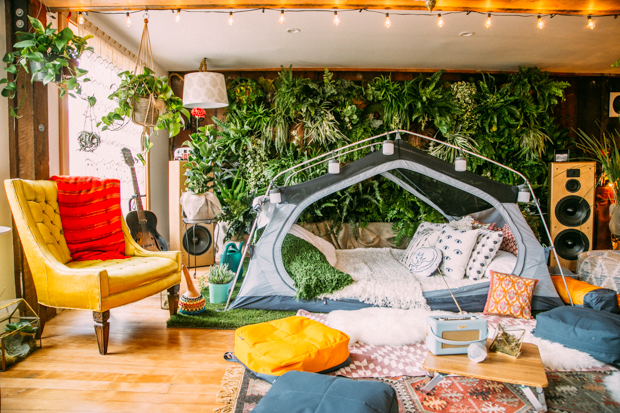 การตั้งแคมป์ที่บ้านสามารถเลือกพื้นที่กางเต็นท์ได้ ไม่ว่าจะเป็นในห้องนั่งเล่น ในสวน หรือแม้แต่ในห้องนอน ก็สามารถตกแต่งให้ออกมาเป็นสไตล์แคมป์ปิ้งได้