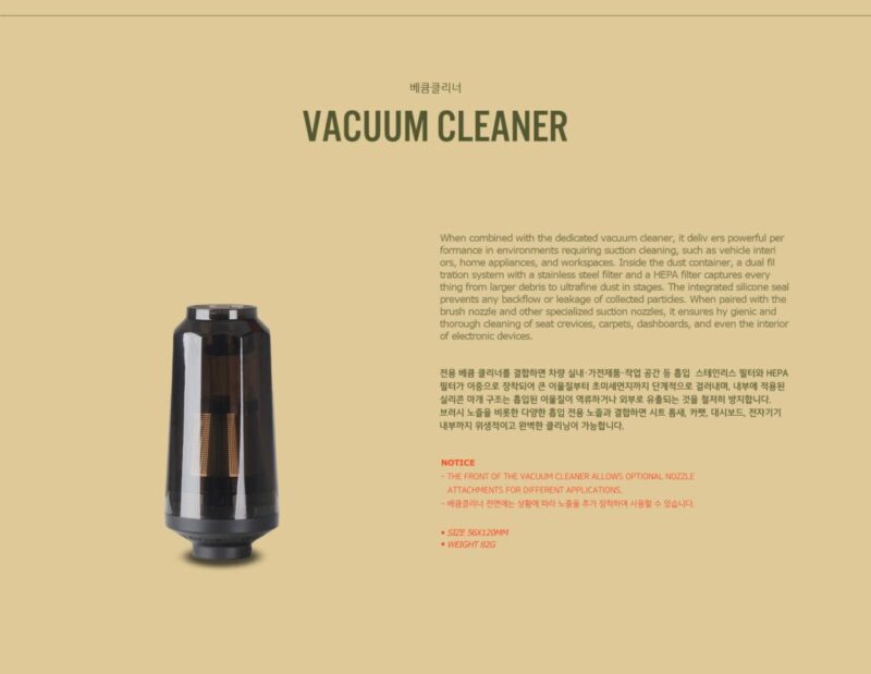 เข้าถึงทุกซอกมุมด้วยหัวเปลี่ยนหลากหลาย ด้านหน้าของ Vacuum Cleaner ออกแบบมาให้สามารถต่อกับหัวดูด (Nozzle) ต่างๆ ของชุด Jet Air Gun ได้ (เช่น หัวแปรง) ทำให้สามารถทำความสะอาดได้ลึกถึงร่องเบาะรถยนต์, คีย์บอร์ด, พรม, มุ้งลวด หรือหน้าต่าง ได้อย่างสะดวกสบาย