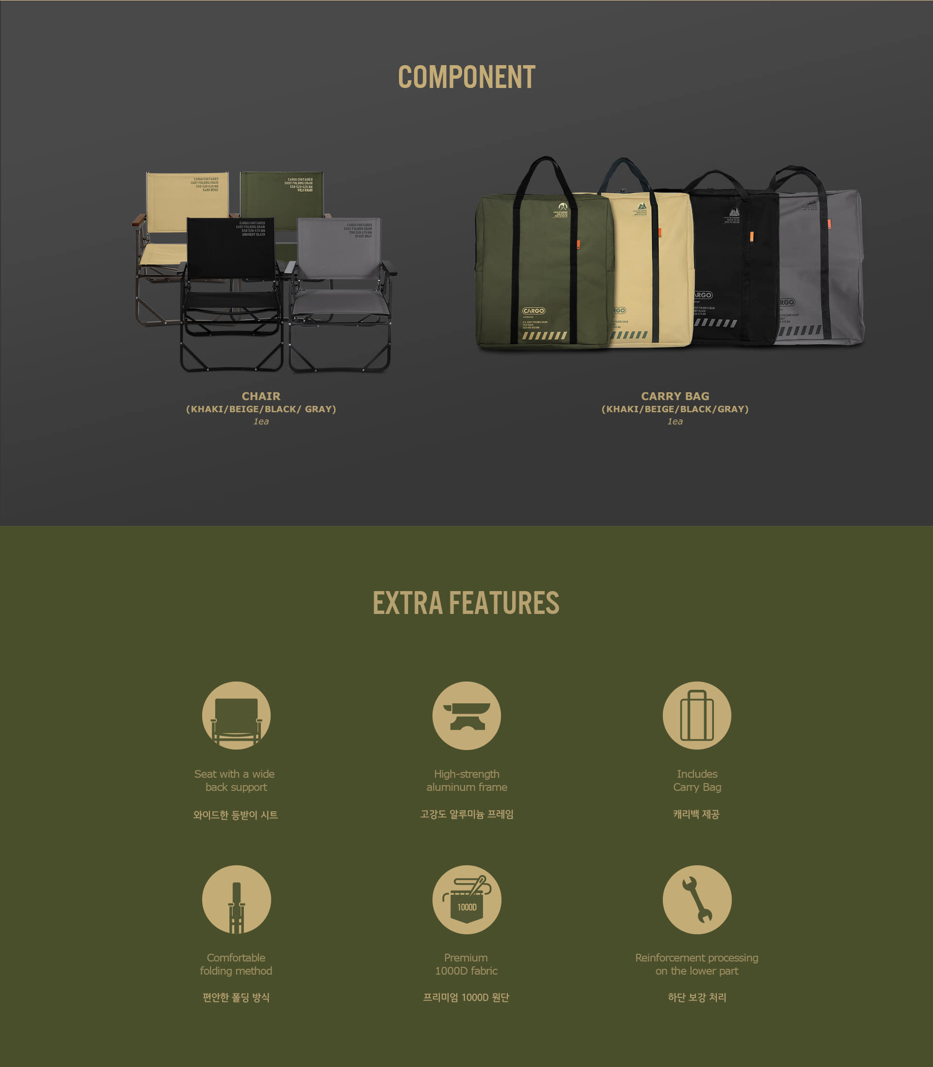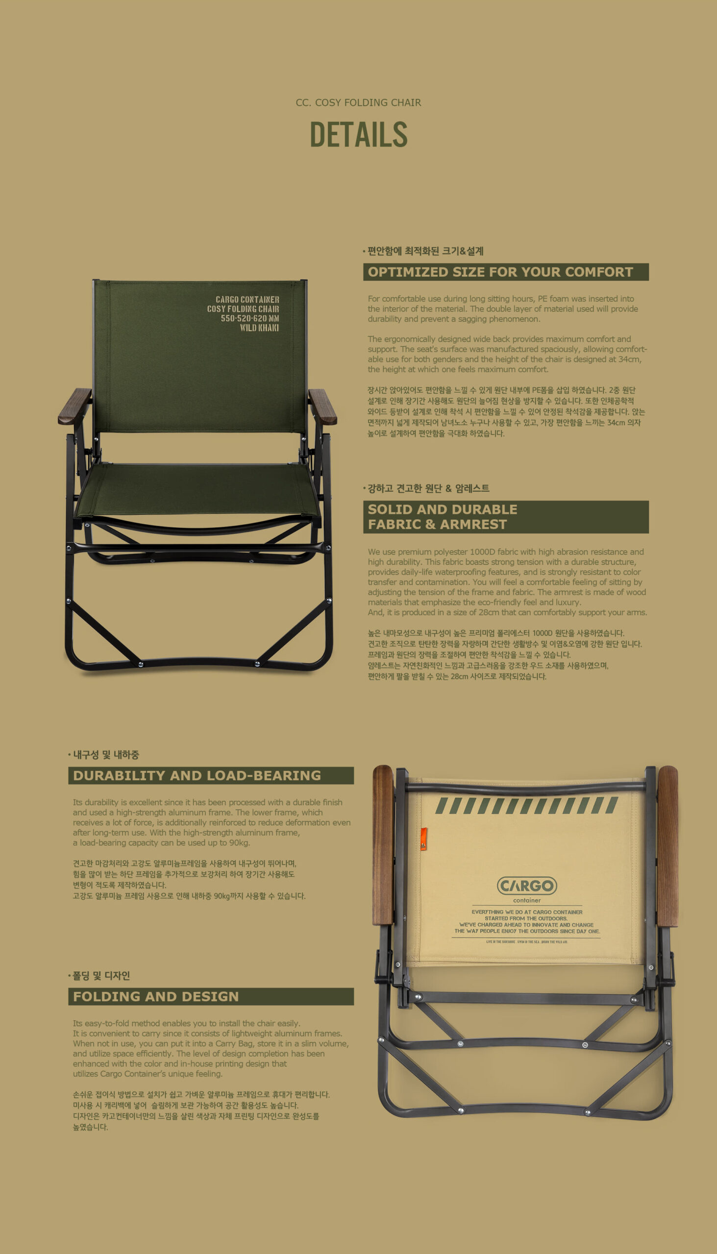 รายละเอียด : เก้าอี้ cosy folding chair เป็นผลิตภัณฑ์ที่ผลิตโดยคำนึงถึงความสะดวกสบายและความทนทานเป็นอันดับแรก ขนาดกระทัดรัดที่ทุกคนสามารถนั่งได้อย่างสบาย เพื่อความทนทาน โครงหน้า/หลังเสริมความแข็งแรง และใช้ผ้าพรีเมี่ยม1000D รองรับน้ำหนักได้ถึง 90 กิโลกรัม โครงอลูมิเนียมทำให้น้ำหนักเบา แข็งแรง พับได้มาพร้อมกระเป๋าอย่างดีสะดวกต่อการจัดเก็บ