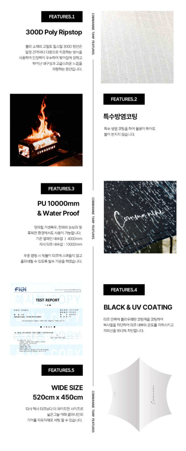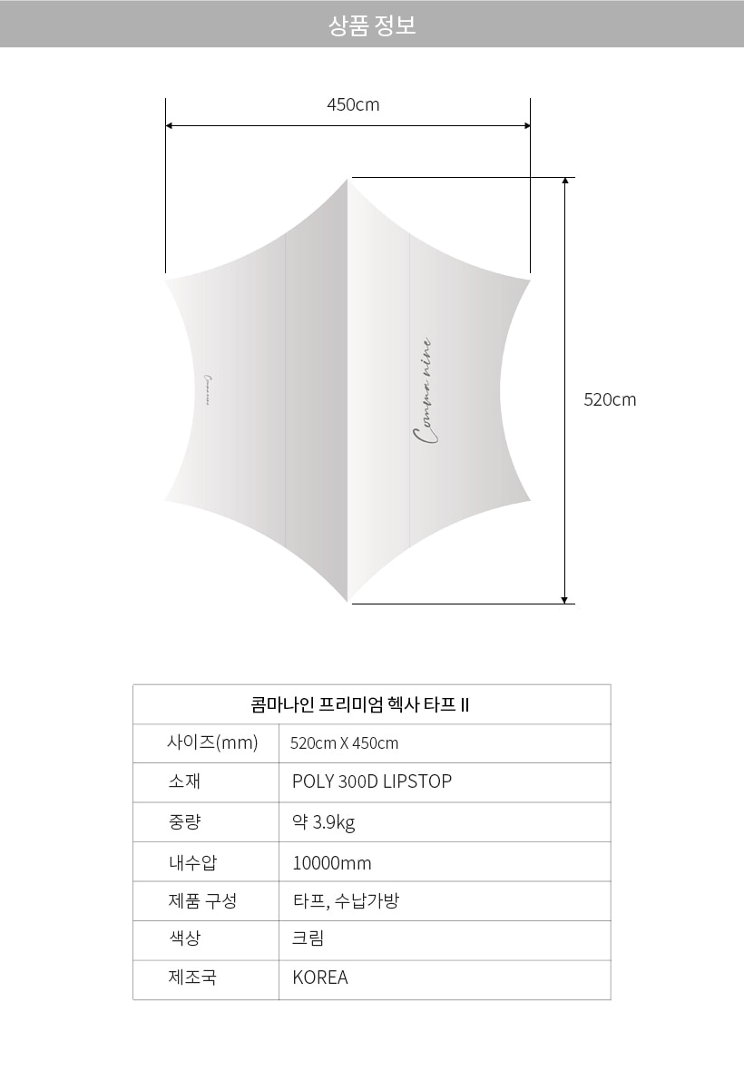 รายละเอียด : ทาร์ปทรง Hexa จาก Comma nine ผลิตจากผ้า Poly 300D Ripstop ความหนาแน่นสูง มีความต้านทานต่อแรงดึงที่ดีเยี่ยม ทำให้ทนทานต่อการฉีกขาด และยังเคลือบสารป้องกันสะเก็ดไฟ สามารถใช้งานได้ในสภาพอากาศที่ฝนตกหนัก ด้านในยังเคลือบสารกัน UV ที่ช่วยลดอุณหภูมิได้ในช่วงอากาศร้อน และขนาดที่กว้างถึง 5.2 x 4.5 m จึงสามารถใช้งานได้หลายคน
