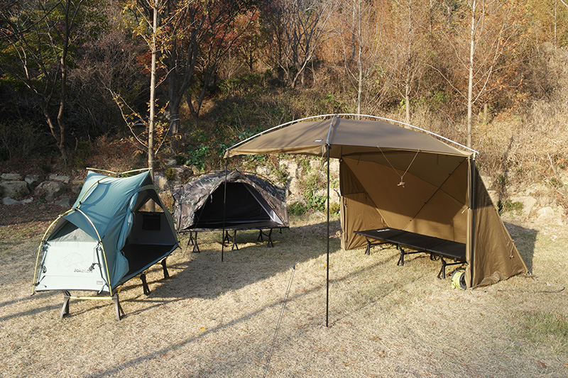 J.cot ยังมีความสามารถในการเชื่อมต่อหลายเตียงเข้าด้วยกันด้วยสายรัดด้านล่าง ทำให้มั่นคงไม่แยกจากกัน วัสดุของเตียงทำจากโพลีเอสเตอร์ 900D w/r PU ที่แข็งแรง ทนทาน และกันน้ำ ไม่ยืดตัวแม้ใช้งานเป็นเวลานาน เสา DAC คุณภาพสูง Th72m ช่วยลดน้ำหนักและเพิ่มความทนทาน นอกจากนี้ ด้านล่างของเตียงยังมีวงแหวน TPU 8 วงสำหรับการขยายอุปกรณ์เสริมในอนาคต