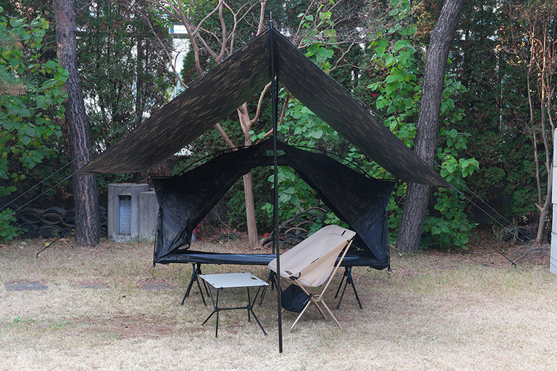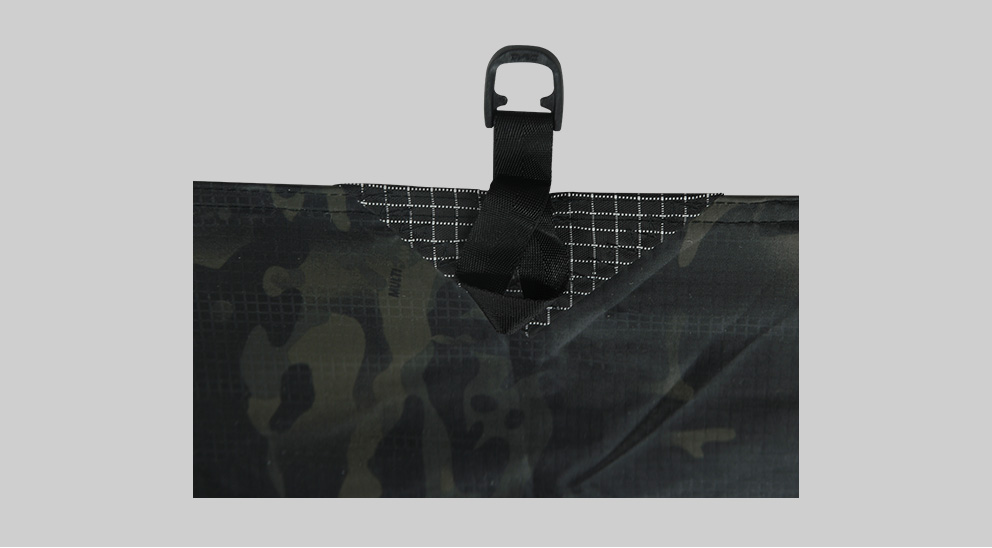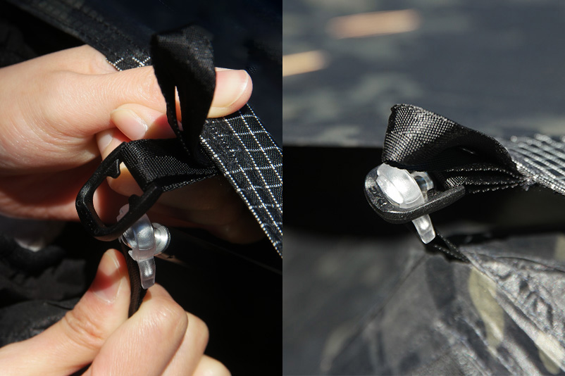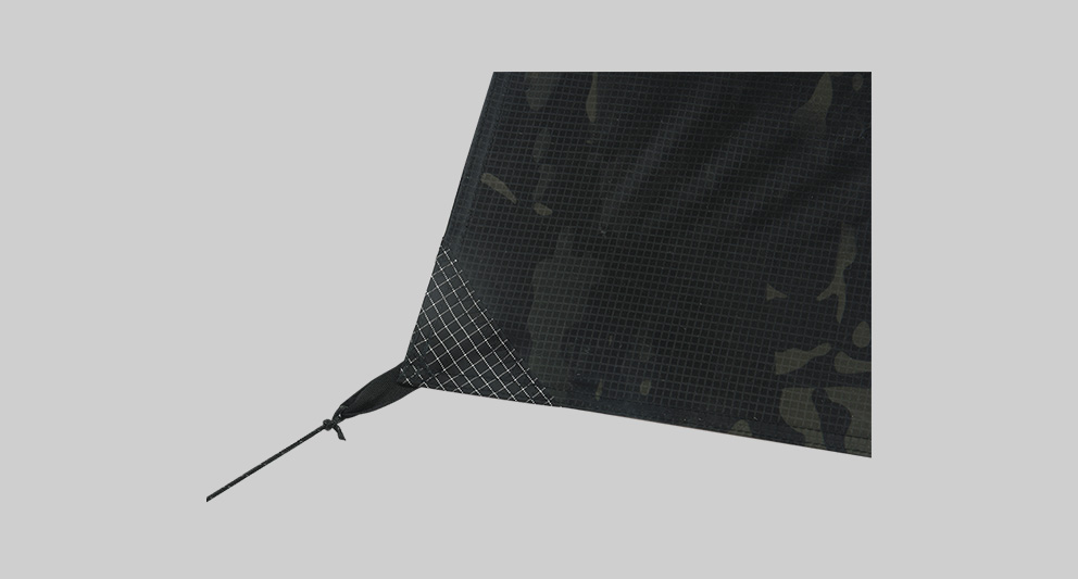 การเชื่อมต่อเต็นท์ J.cot และทาร์ปทำได้ง่ายด้วย DAC SQ Ring และวงแหวน 10 วงที่ติดอยู่กับทาร์ป เชือกทำจากวัสดุ Dyneema ที่เบาและแข็งแรงสูง เชือกนี้ช่วยยึดผ้าทาร์ปกับพื้นหรือเสาได้อย่างมั่นคง นอกจากนี้ ตัวสต็อปเปอร์จาก British Clamcleats ที่มีน้ำหนักเบาและทนทาน ช่วยปรับความตึงของเชือกได้ง่ายและสะดวก