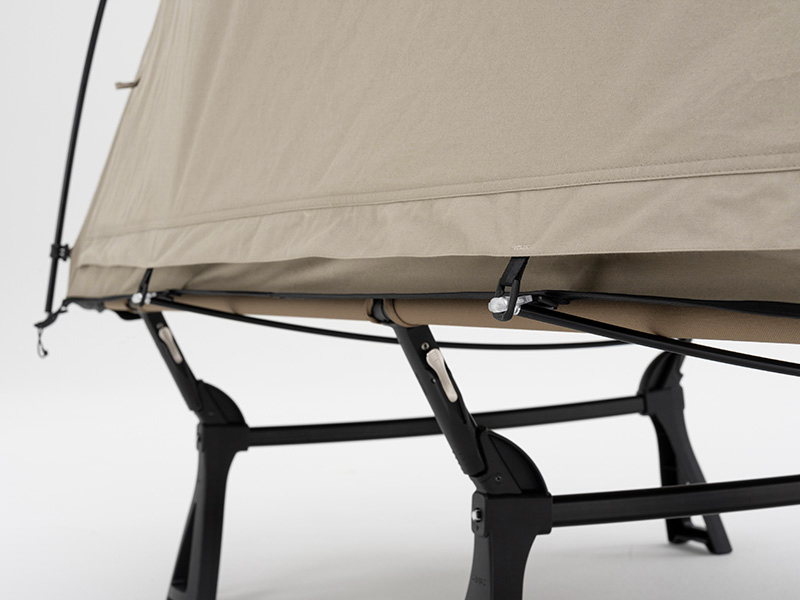 ตัวเต็นท์ผลิตจาก ผ้า TC (ผสมฝ้าย) คุณภาพสูง ซึ่งให้การป้องกันแสงแดดดีกว่าผ้าโพลีเอสเตอร์ และมีคุณสมบัติระบายอากาศยอดเยี่ยม ช่วยให้อากาศถ่ายเทได้ดี ไม่อับชื้น เย็นสบายในฤดูร้อน และให้ความอบอุ่นในฤดูหนาว โดยยังเคลือบกันน้ำทั้งสองด้าน เพิ่มความมั่นใจเมื่อต้องเจอฝนหรือความชื้นโดยไม่สูญเสียความสามารถในการระบายอากาศ