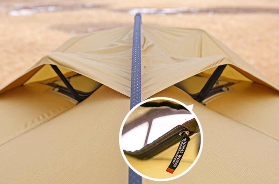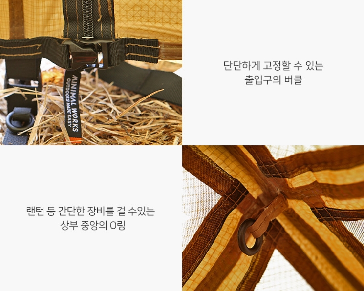 ประตูทางเข้าสี่ทาง สะดวกต่อการใช้งานด้วยซิปและตัวล็อคแบบสลับ ช่องระบายอากาศที่ด้านบนมีตาข่ายปิดเพื่อป้องกันแมลงเข้ามา และเพิ่มซิปเพื่อให้เปิดและปิดได้ง่ายจากภายใน