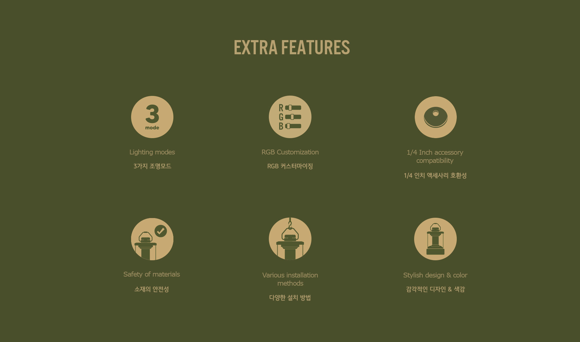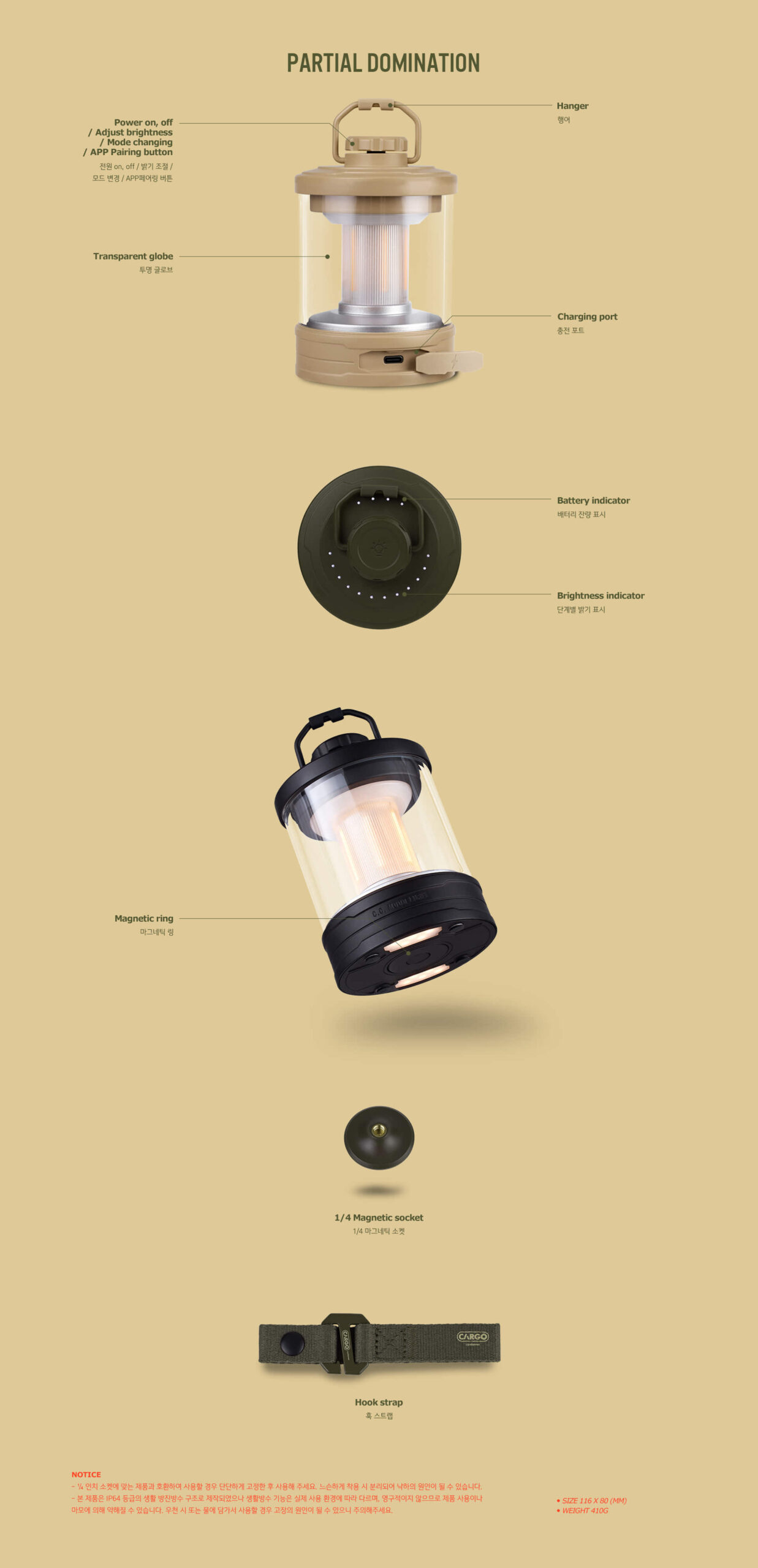 โดดเด่นด้วยระบบปรับแต่งสี RGB ที่ควบคุมผ่านแอปพลิเคชันบนสมาร์ทโฟน สามารถบันทึกและเรียกใช้สีที่ชื่นชอบได้อย่างรวดเร็ว ตัวโคมไฟผลิตจากอลูมิเนียมเกรดพรีเมียม น้ำหนักเบา ทนทาน พร้อมระบบระบายความร้อนประสิทธิภาพสูง ติดตั้งได้หลากหลายด้วยสายรัดพิเศษ แหวนแม่เหล็ก และช่องเสียบอุปกรณ์เสริม เหมาะสำหรับทุกกิจกรรม ไม่ว่าจะเป็นการตั้งแคมป์ จัดสวน ตกแต่งบ้าน งานปาร์ตี้