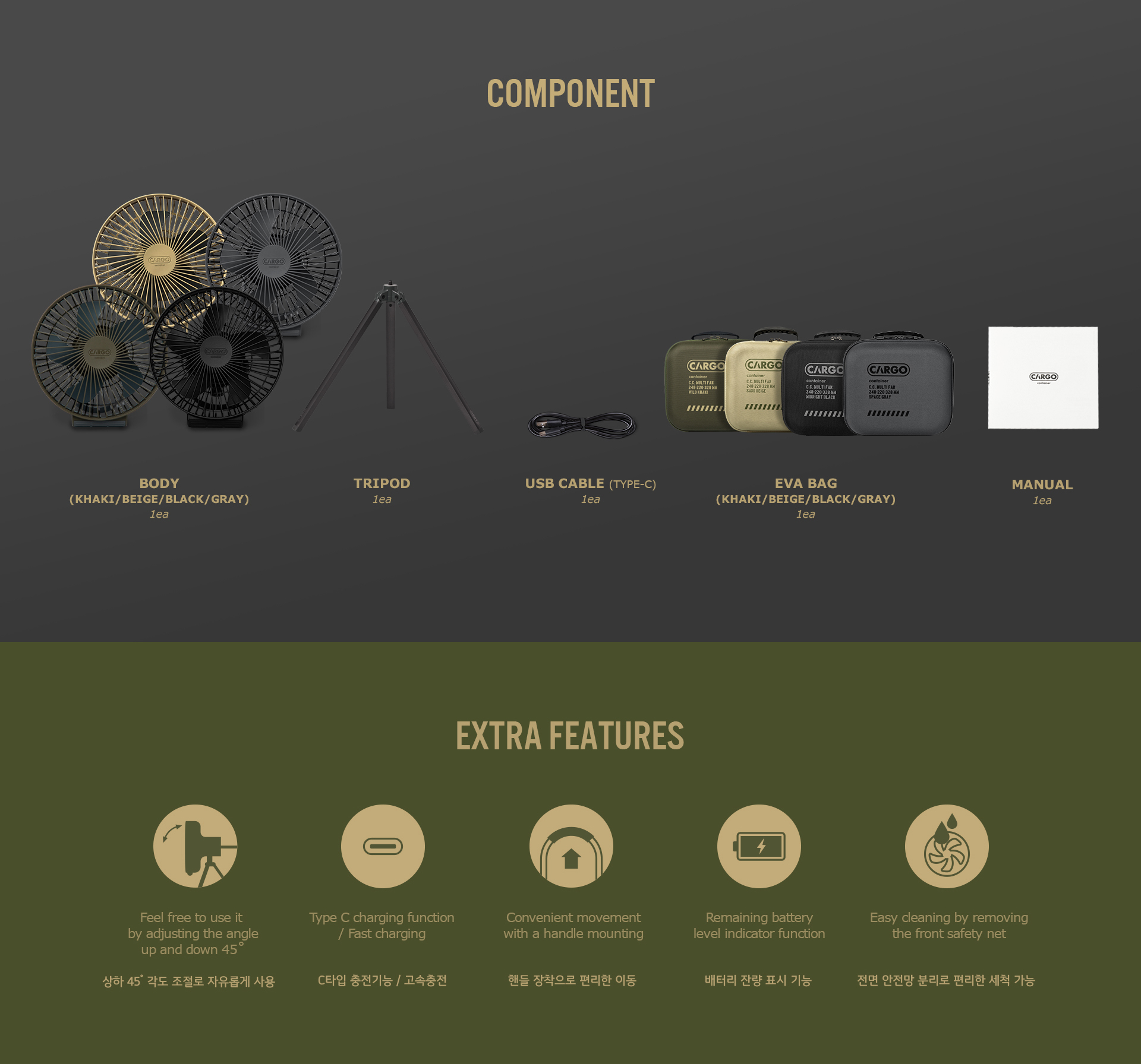 รายละเอียด : พัดลมพกพาจากแบรนด์ Cargo Container ประเทศเกาหลี ดีไซน์สุดเท่พร้อมฟังก์ชั่นการใช้งานยอดเยี่ยมที่ทำให้คุณอยากพกพาไปทุกที่ มีการไหลเวียนของอากาศอย่างทั่วถึงด้วยใบพัด 5 ใบ ปรับความเร็วลมได้ 4 ระดับ และมอเตอร์ BLDC ที่มีเสียงรบกวนต่ำ ดังนั้นจึงสามารถใช้เป็นพัดลมตัวโปรดได้ตลอดทั้งปี แบตเตอรี่ความจุสูง 10,000mAh เวลาในการชาร์จ ประมาณ 8.5 ชั่วโมง ระยะเวลาการใช้งาน ลมสูงสุดประมาณ 10 ชั่วโมง ~ ปริมาณลมต่ำสุดประมาณ 45 ชั่วโมง ซิลิกอนติดอยู่กับตัวเครื่อง จึงใช้งานได้อย่างมั่นคงโดยไม่สั่นแม้ว่าจะถอดขาตั้งออกแล้วก็ตาม ใช้งานได้หลากหลาย เช่น ตั้ง แขวน และขาตั้ง (ปรับมุมได้) มาพร้อมกับเคสหรือกระเป๋าจัดเก็บกันกระแทกที่สะดวกต่อการพกพา