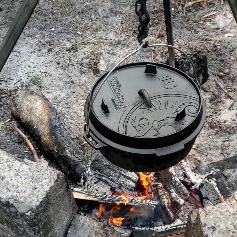 Dutch oven หม้อทำอาหารเหล็กหล่อ ft6 ขนาดสำหรับ จำนวนคน 4-8 คน มีขาตั้ง 3 ขา ความจุสูงสุดของหม้อ 5.5 ลิตร และฝา 1.5 ลิตร เหมาะสำหรับการทำอาหารบนกองไฟ ปรุงอาหารได้ทั้งประเภทผักและเนื้อสัตว์ ด้วยคุณสมบัติพิเศษน้ำภายในอาหารจะไม่ระเหยออกไปมากเหมือนหม้อทั่วไปทำให้อาหารมีความชุ่มชื้นกรอบนอกนุ่มใน ฝาปิดออกแบบมาเป็นพิเศษที่สามารถใช้เป็นกระทะหรือแผ่นปิ้งย่าง