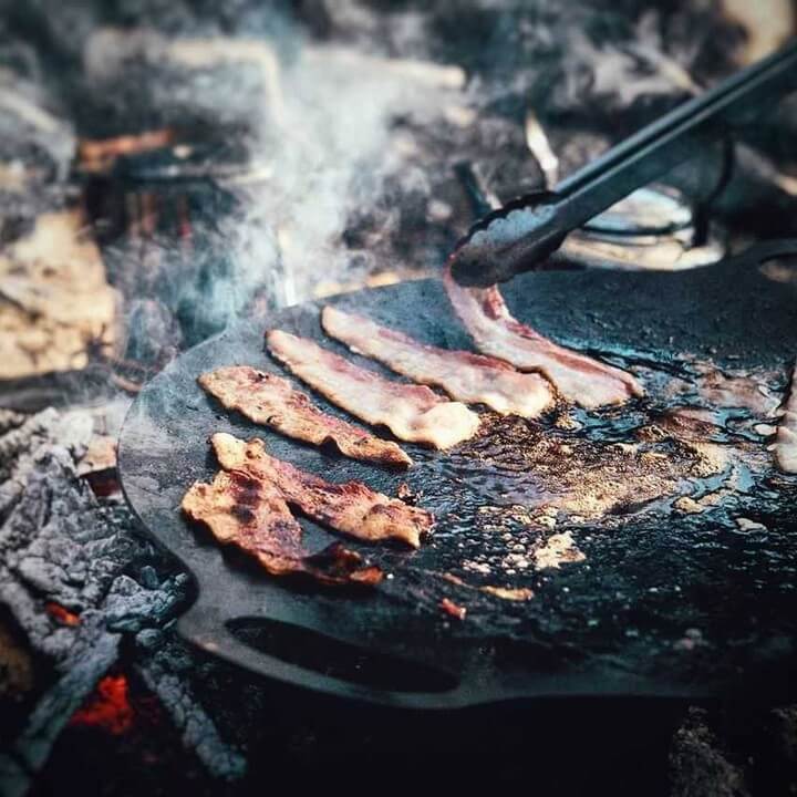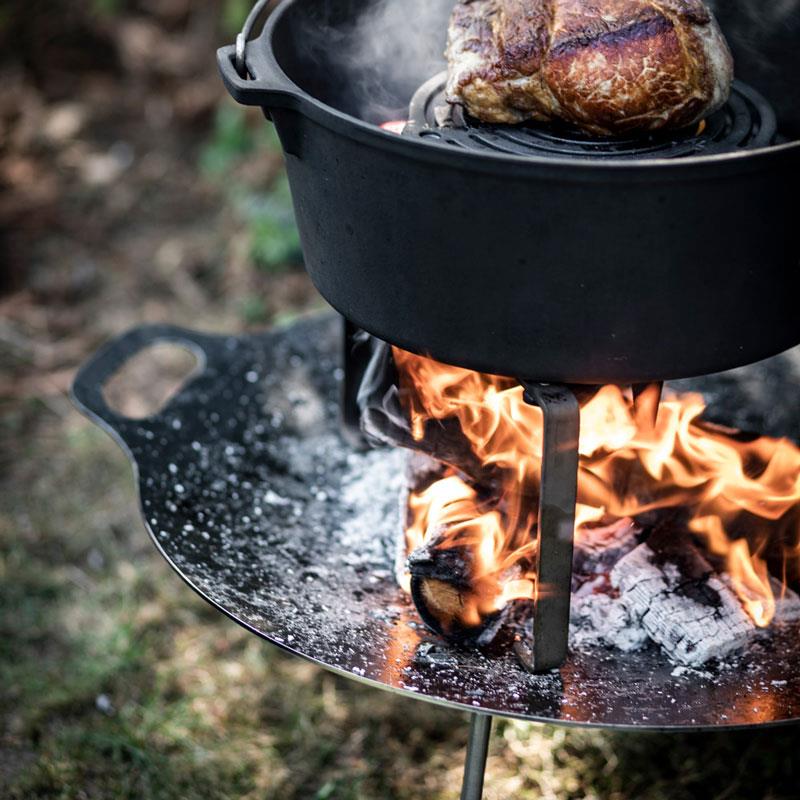 กระทะเหล็กสำหรับย่างอาหาร และถาดก่อไฟ ที่ทำจากเหล็กคุณภาพเยี่ยมขึ้นรูปอย่างดี โดยไม่ทำความเสียหายให้พื้นที่ด้านล่าง ตัวถาดสามารถวางฟืนบนขาตั้งสามขา และก่อฟืนไฟด้านล่างได้ เพื่อใช้ปรุงอาหารผิวกระทะ ทำความสะอาดได้ง่าย แข็งแรง ทนทาน ใช้งานได้ดี