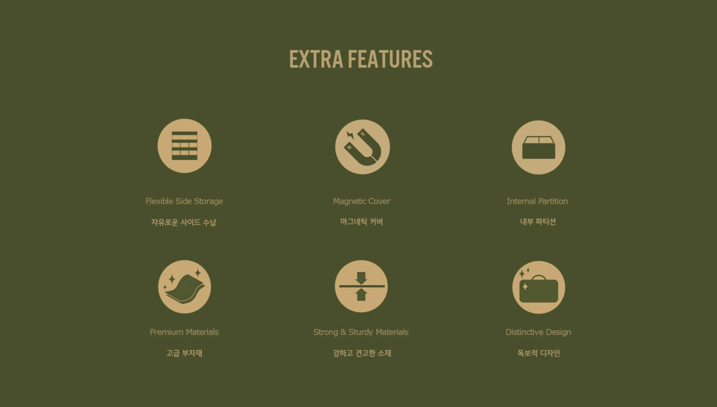 รายละเอียด : กระเป๋าข้างอเนกประสงค์ ‘SIDE STORAGE BAG’ ที่ได้รับการออกแบบให้มีที่แขวนแบบสายรัดที่พัฒนาขึ้นเองซึ่งสามารถยึดในแนวนอนไปทางด้านหลังได้ นอกจากนี้ มีการใช้ตัวล็อค ‘FIDLOCK’ ของเยอรมันเพื่อการยึด/ปลดที่ง่ายดาย และยังมีการผลิตปุ่มแบบ snap ที่สามารถยึดในแนวตั้งได้ ดังนั้นจึงสามารถติดตั้งและใช้กับผลิตภัณฑ์ต่างๆได้ เพิ่มความสะดวกสูงสุดด้วย ฝาเปิด/ปิดที่ทำด้วยแม่เหล็ก คุณจึงสามารถเปิดและปิดได้อย่างสะดวกและง่ายดาย แม้ว่าจะมีน้ำหนักเพียง 400 กรัม แต่ก็สามารถรับน้ำหนักได้ถึง 3 กก. เนื่องจากมีแผ่น PP ภายในที่ใส่ไว้ ช่วยให้คุณเก็บของที่มีน้ำหนักมากได้