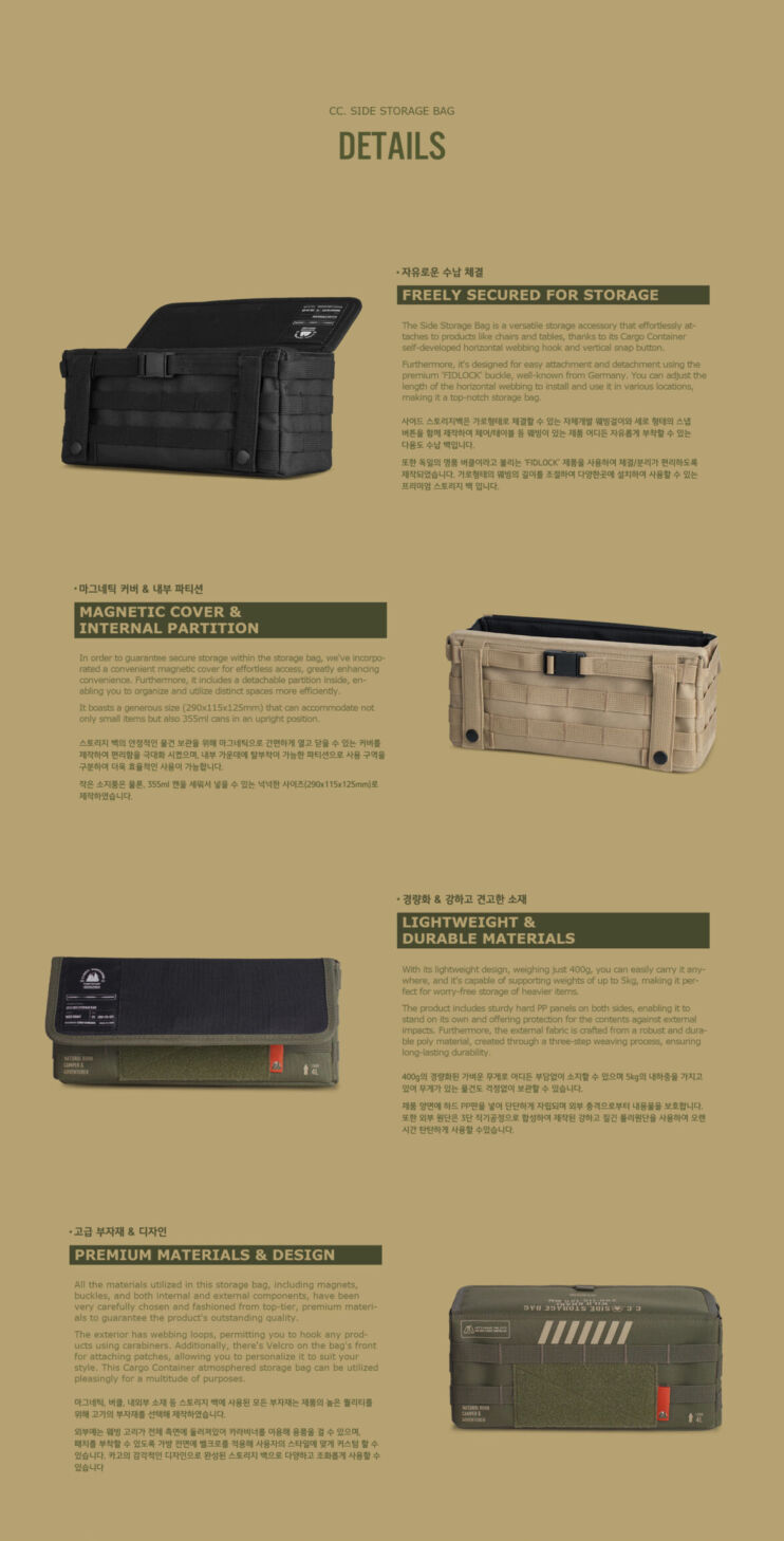 รายละเอียด : กระเป๋าข้างอเนกประสงค์ ‘SIDE STORAGE BAG’ ที่ได้รับการออกแบบให้มีที่แขวนแบบสายรัดที่พัฒนาขึ้นเองซึ่งสามารถยึดในแนวนอนไปทางด้านหลังได้ นอกจากนี้ มีการใช้ตัวล็อค ‘FIDLOCK’ ของเยอรมันเพื่อการยึด/ปลดที่ง่ายดาย และยังมีการผลิตปุ่มแบบ snap ที่สามารถยึดในแนวตั้งได้ ดังนั้นจึงสามารถติดตั้งและใช้กับผลิตภัณฑ์ต่างๆได้ เพิ่มความสะดวกสูงสุดด้วย ฝาเปิด/ปิดที่ทำด้วยแม่เหล็ก คุณจึงสามารถเปิดและปิดได้อย่างสะดวกและง่ายดาย แม้ว่าจะมีน้ำหนักเพียง 400 กรัม แต่ก็สามารถรับน้ำหนักได้ถึง 3 กก. เนื่องจากมีแผ่น PP ภายในที่ใส่ไว้ ช่วยให้คุณเก็บของที่มีน้ำหนักมากได้