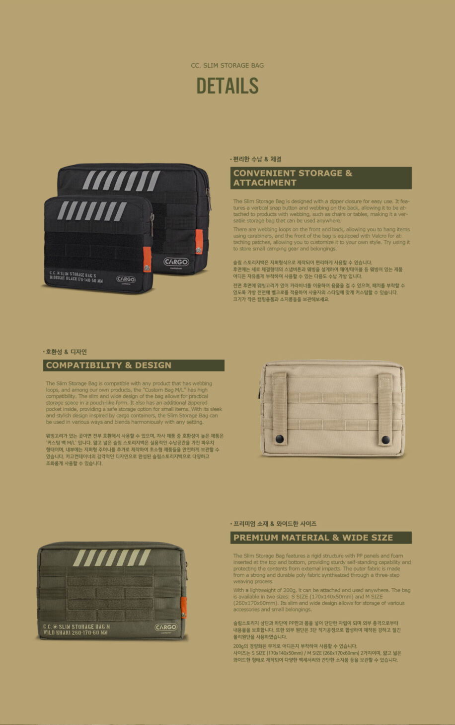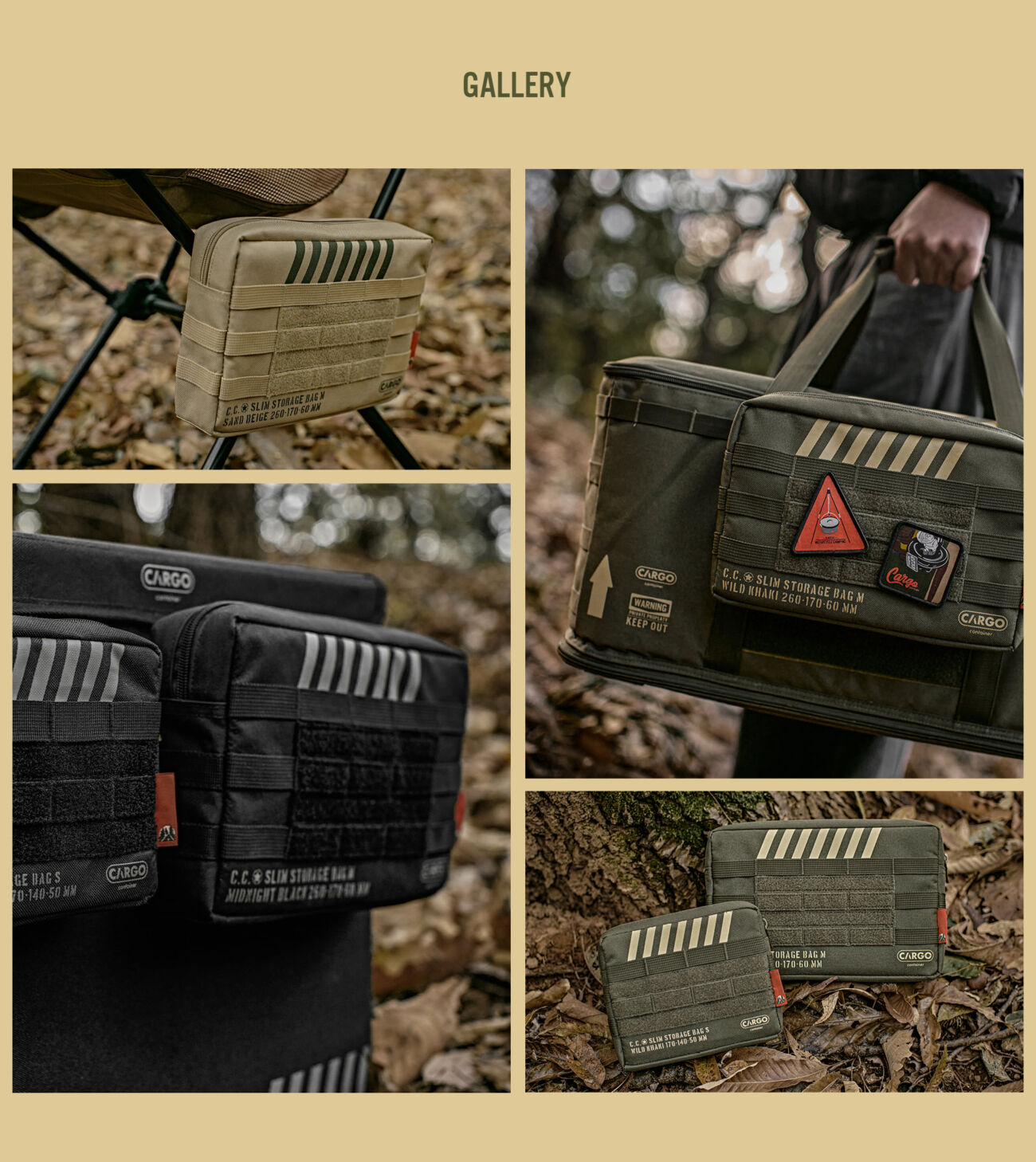 รายละเอียด : SLIM STORAGE BAG M ได้รับการออกแบบให้มีซิปปิดเพื่อให้ใช้งานง่าย มีปุ่มล็อคแนวตั้งและสายรัดที่ด้านหลัง ช่วยให้สามารถติดกับเก้าอี้หรือโต๊ะ ทำให้เป็นถุงเก็บของอเนกประสงค์ที่สามารถใช้งานได้ทุกที่ มี molle straps ที่ด้านหน้าและด้านหลัง ช่วยให้คุณแขวนสิ่งของโดยใช้คาราไบเนอร์ได้ และด้านหน้าของกระเป๋ามีแถบตีนตุ๊กแกสำหรับติดแผ่นแปะ ทำให้คุณปรับแต่งตามสไตล์ของคุณเองได้