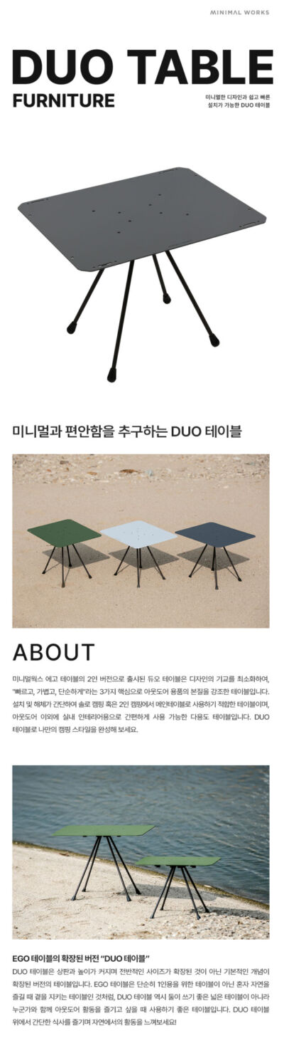 รายละเอียด : Minimal Works table duo เป็นโต๊ะสำหรับสองคน โดยลดเทคนิคการออกแบบลง และเน้นย้ำถึงแก่นแท้ของอุปกรณ์กลางแจ้งด้วยสามหลักการ “รวดเร็ว เบา และเรียบง่าย”