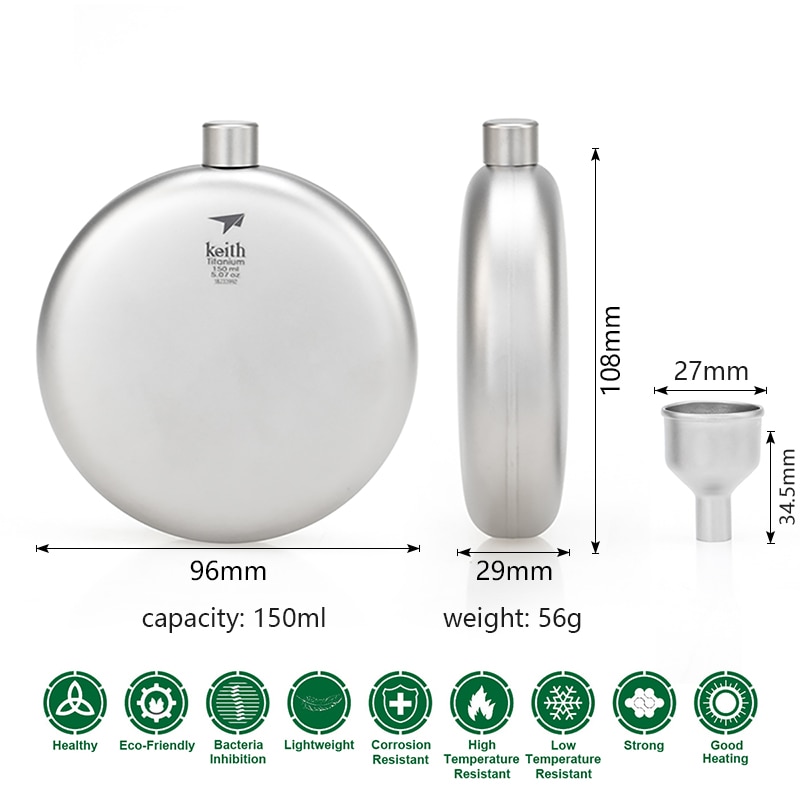 รายละเอียด : ขวดแบนพกพาทรงกลมไทเทเนียมรุ่น TI9302 ขนาด 150 ml ดีไซน์ทรงกลมสวยงาม ขนาดกะทัดรัด พกพาสะดวก ด้วยขนาด 108 × 96 × 29 มม. และน้ำหนักเบาเพียง 56 กรัม ทำจากไทเทเนียมแท้ จึงทนทาน ไม่เป็นสนิม และใช้งานได้ยาวนาน