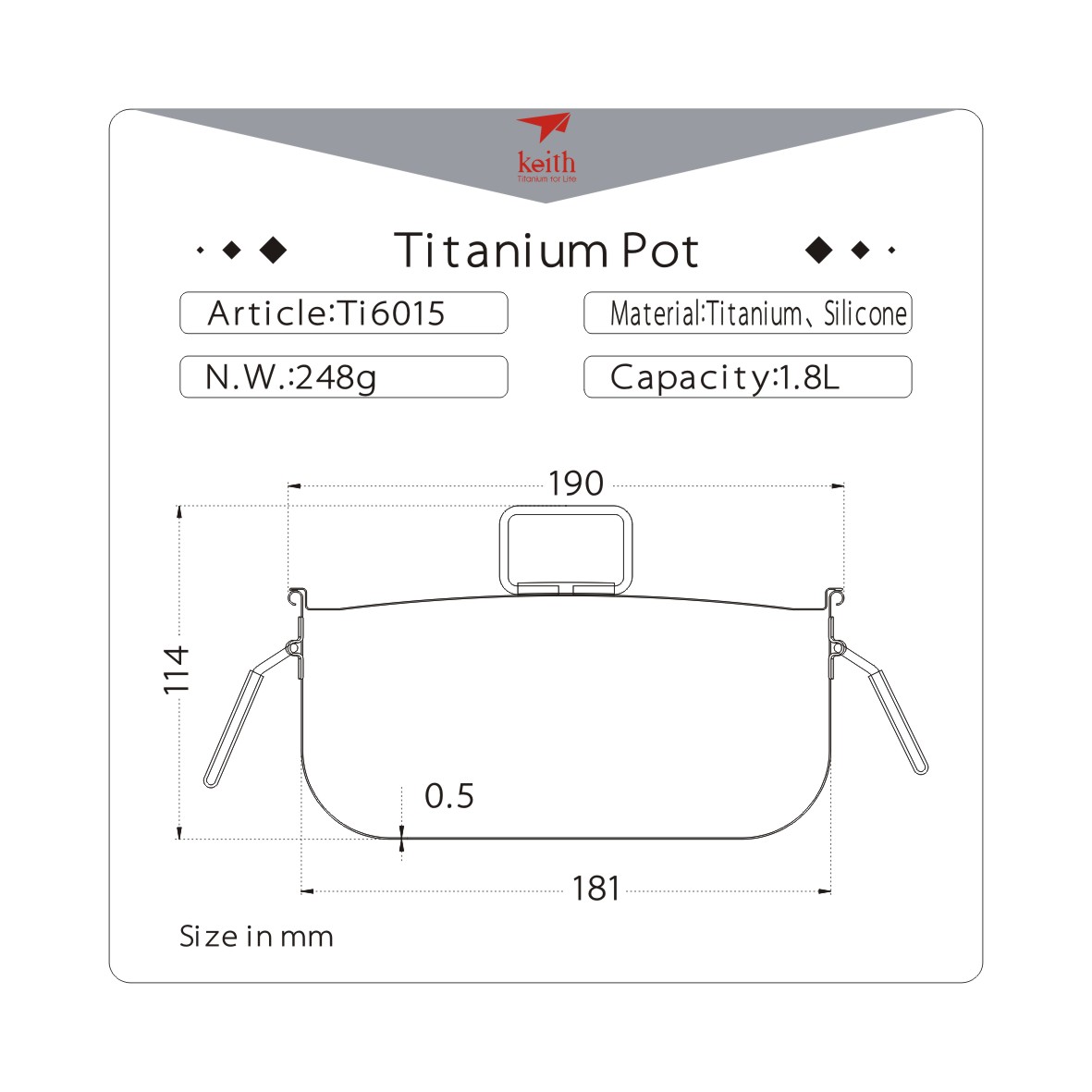 รายละเอียด : ชุดหม้อไทเทเนียมขนาด 1.8L พร้อมฝาปิด น้ำหนักเบาเพียง 248 กรัม มาพร้อมหูจับหุ้มซิลิโคนทนความร้อนสูงที่สามารถพับเก็บได้ ทำจากไทเทเนียมบริสุทธิ์ 99.9% มีคุณสมบัติแข็งแรงทนทาน ปลอดภัย ไม่มีสารพิษ ไม่เป็นสนิม และทนต่อการกัดกร่อน สามารถใช้งานได้ในอุณหภูมิสูงถึง 1600 องศาเซลเซียส โดยไม่เสียรูปทรงแม้อุณหภูมิสูง และยังมีความแข็งแรงสูงในที่เย็นถึง -253 องศาเซลเซียส ขนาดกะทัดรัดพกพาสะดวก พร้อมผิวขัดทรายที่ให้ความหรูหรา เหมาะสำหรับการเดินทางทุกรูปแบบ การันตีความทนทานและคุณภาพในการใช้งานที่ยาวนาน