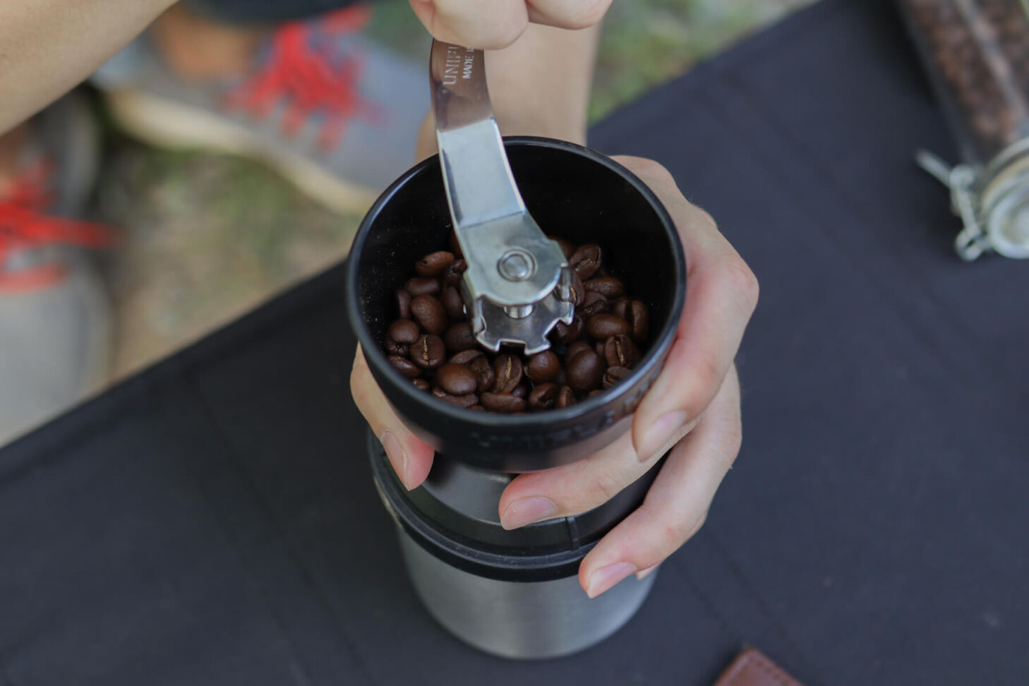 ที่บดกาแฟจาก Uniflame เฟืองบดทำจากสแตนเลส ปรับความละเอียดได้ตามความต้องการ บดกาแฟได้สูงสุดครั้งละ 50 กรัม